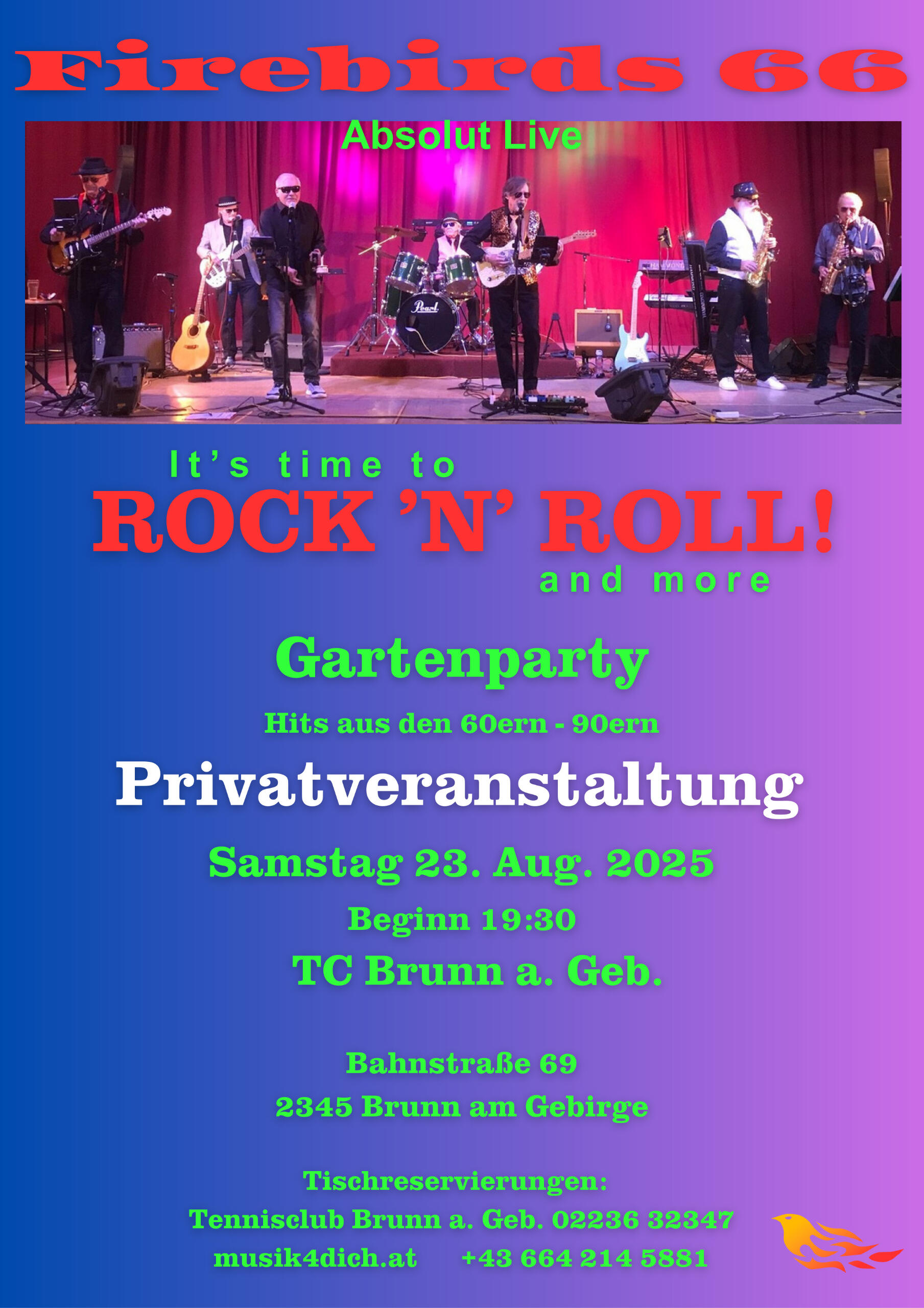 Rock 'n' Roll, Songs der Rolling Stones, Beatles, von Elvis, Fats Domino u.v.m. Aber auch aktuelles ist im Repertoire reichlich vorhanden.Wir stellen uns gut auf den Musikgeschmack unseres Publikums ein und präsentieren unsere Songs in einer vernünftigen Lautstärke, können aber auch auf größeren Bühnen so richtig Stimmung machen.Auf Wunsch sind natürlich auch Standards im Programm. Unsere Freude an der Musik ist bei jedem einzelnen spürbar, bei diversen Stimmungsliedern können wir unsere Gäste begeistern und zum mitmachen animieren.Natürlich spielen wir auch bei Geburtstagsfeiern, Partys und dergleichen, wobei Spaß und Freude an der Musik an erster Stelle stehen. Just for Fun!